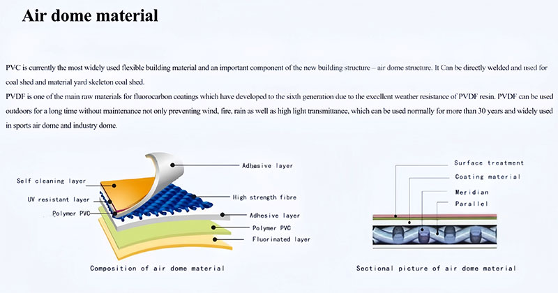 We have a wide range of air dome tents for sale, which can be used for football fields, sports fields, coal plants, swimming pools, garbage treatment plants, thermal power plants, coal storage sheds, raw material storage for coking plants, cement plants, landfill inflatable membranes, etc. Air dome tents is popular in the sports market and industry farm as it gives a sophisticated look and feel to any function. Compared with other colors, white tarpaulin effect is more outstanding. which will make the decoration possibilities endless.